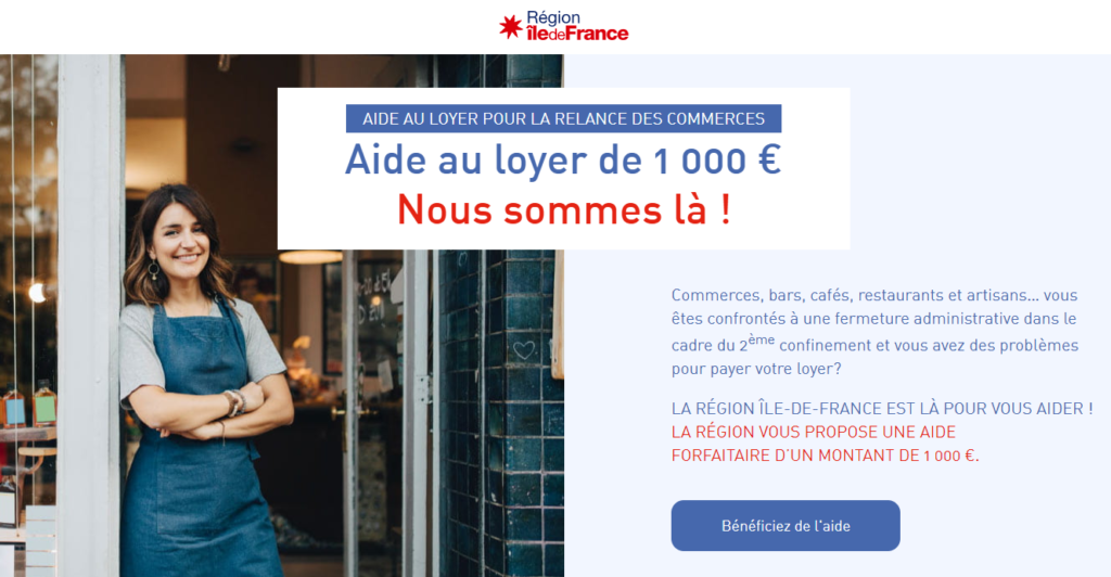 La Région Ile-de-France renouvelle l’aide au loyer de 1 000€ pour tous les artisans, commerçants et restaurateurs franciliens qui subissent une fermeture administrative.