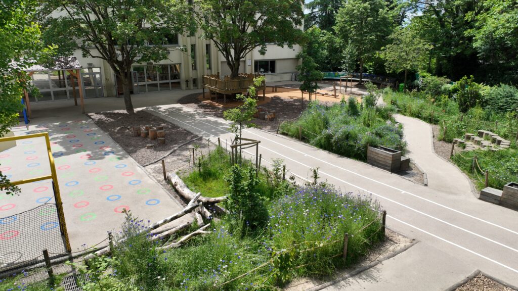 Dans le secteur scolaire, les nouvelles cours oasis permettent de transformer des cours entièrement bétonnées en espaces ludiques où le bois, la paillage et les surfaces végétalisées confèrent un agrément immédiat aux élèves tout en offrant des espaces beaucoup plus frais pour les épisodes caniculaires. Le chemin des écoles dans le quartier de Polangis permet de cheminer autour des écoles maternelles et élémentaires de Polangis de manière plus sécurisé sur des revêtements perméables à l’eau et absorbant en partie la chaleur du soleil.