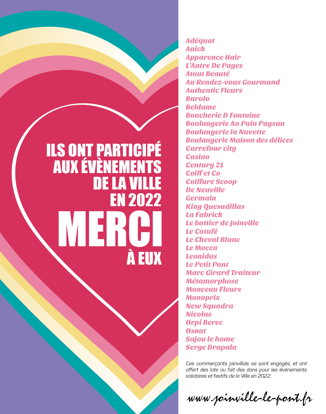 Merci aux commerçants ! Publié le 12 janvier 2024 Un grand merci à tous les commerçants joinvillais qui ont encore une fois permis de faire vivre la Ville en 2023 !