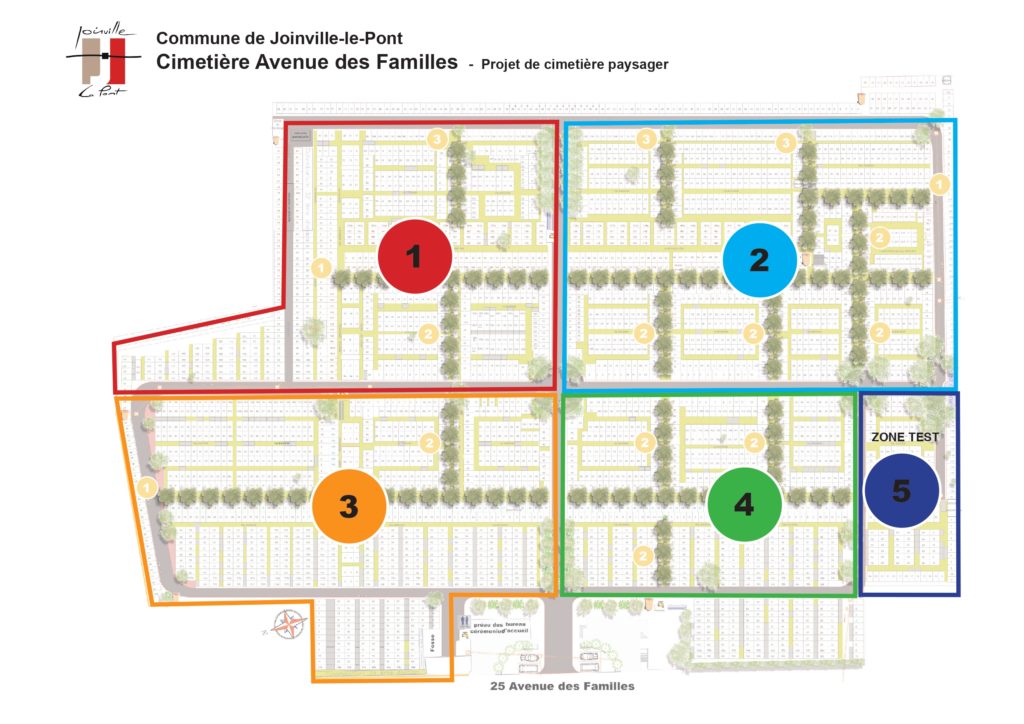 Les travaux de la première phase du projet dénommée « phase test », correspondant à une petite zone du cimetière (zone n°5 sur le plan ci-dessous) ont débutés lundi 20 septembre et devraient se terminer mi-novembre. Suite à cette phase test le grand chantier pourra démarrer et se découpera en plusieurs zones.