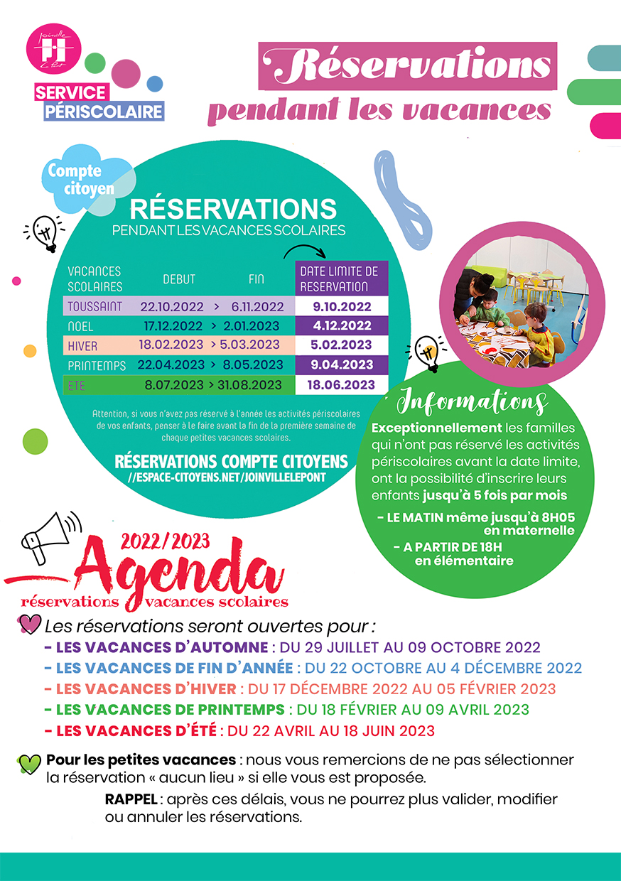 - Accueil de loisirs du mercredi (payant sur réservation via le compte citoyen) de 8H00 à 18H30 (avec possibilité de départ à 13H en fonction de la réservation)