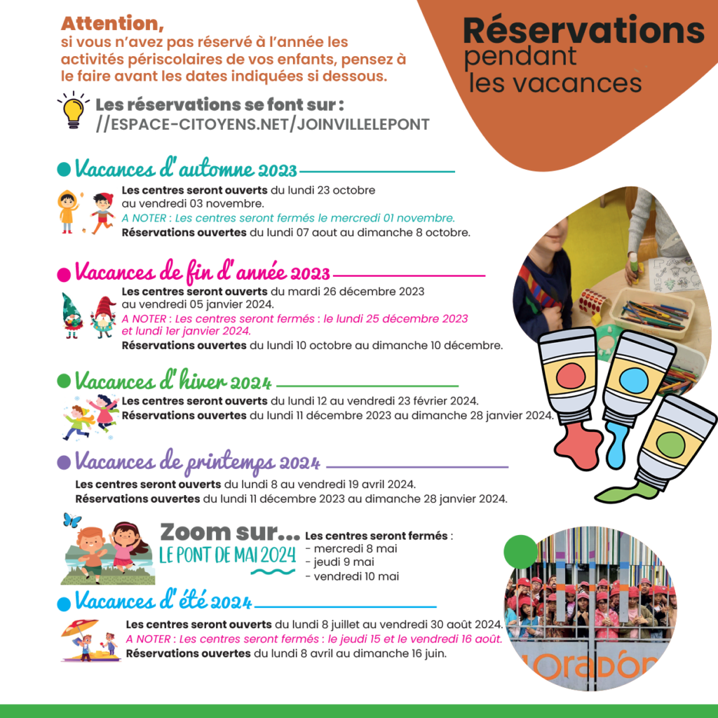 - Accueil de loisirs du mercredi (payant sur réservation via le compte citoyen) de 8H00 à 18H30 (avec possibilité de départ à 13H en fonction de la réservation)