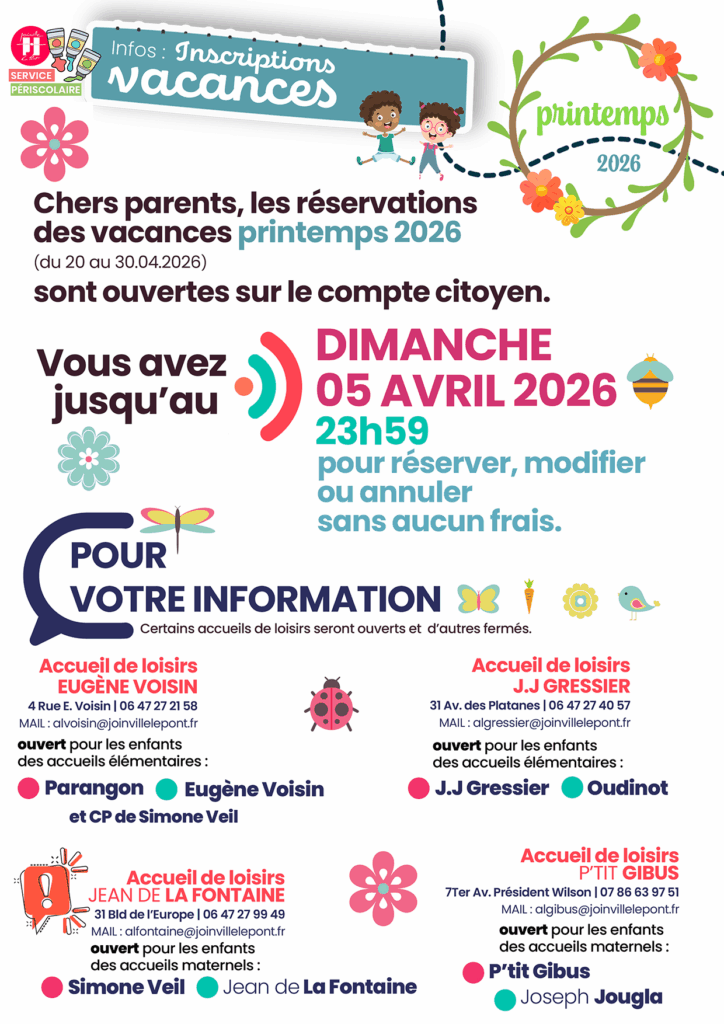 Accueil de loisirs Jean de la Fontaine – 31 Bld de l’Europe – 06.16.40.26.06 ou 06.47.27.99.49 | alfontaine@joinvillelepont.fr